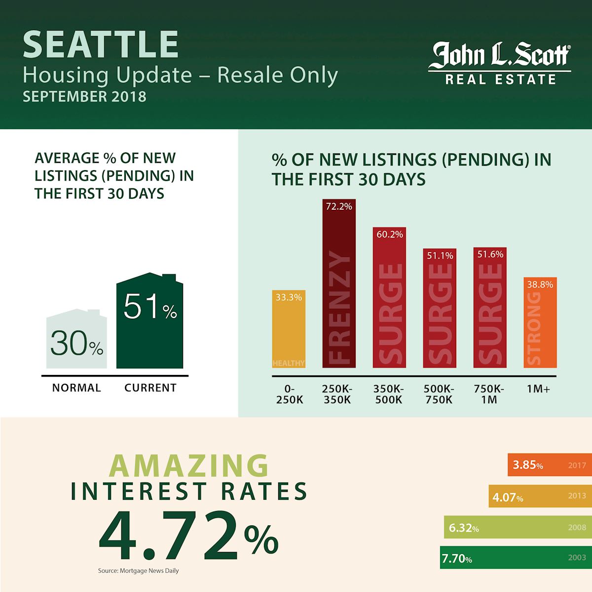 It's likely you have come across an article or two indicating in some fashion the Real Estate market is crashing. It's true the market has slowed down but it is still healthy and competitive. Check out the infographics I have posted below for the Seattle and Eastside markets. This past year, we have seen about 70-80% of homes go pending in less than 30 days. We saw low supply and demand unable to keep up. Today, ~50% of homes are pending in less than 30 days; still an impressive number. Supply is catching up with demand and normalizing the market. The days of listings going pending in two days after receiving 15 offers have lessened, but by no means has the market crashed and is still strong and reflective of Seattle's economical growth.